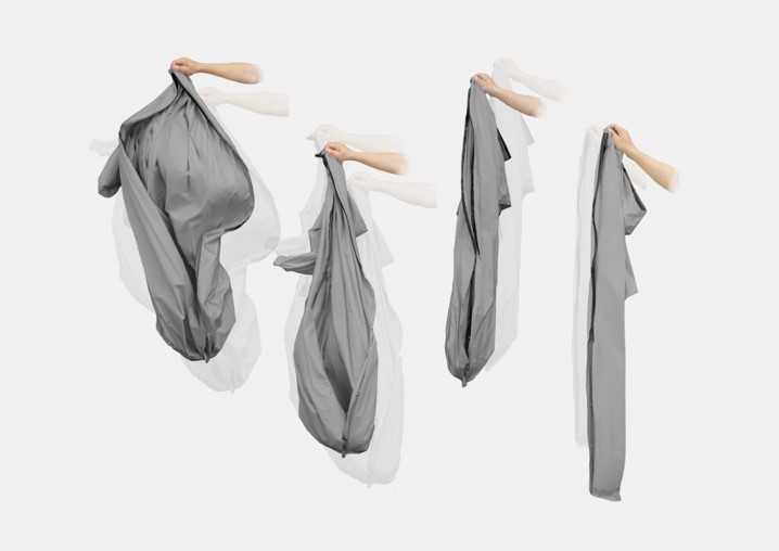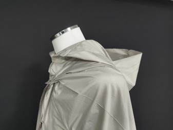 The raincoat presented by Chang and Chen was inspired by origami. While there are many applications of origami in fashion design or other wearable devices, origami is often used to provide structural benefit or visual effect. In this design project, the students used origami for transformation of the raincoat. While general raincoats are difficult to organize after wearing for the rain, the new design allows users to fold the raincoat in just few seconds. By shaking it, the raincoat re-shape itself to a well-folded form by the origami pattern. The water on the surface also drops by following the form to the ground, allowing users to tidy their wet mass rapidly and fight again all the inconvenience in a rainy day.
