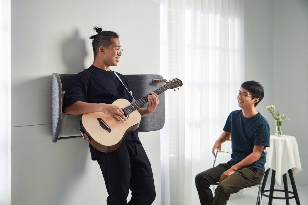 How to create a space for sharing music? This mini stage might be a solution for a guitarist to present her/his musical performance. It can be installed in a restaurant, a train station, or other public space. Passengers or visitors are invited by the instrument hanging on the wall. They take the instrument in hands, lay on the backrest, and perform extemporaneously.