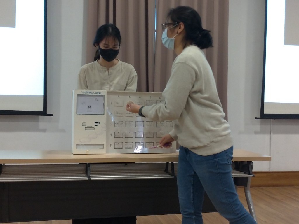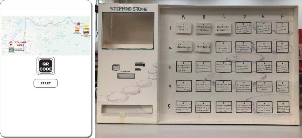 Stepping Stone provides an alternative channel to get information. It is designed for the traveler with public transportations means and encourages them to take an adventure. The service machines are located at train or bus stations and show different written cards in the window. Travelers’ commentaries or reviews are written on the card, and each card represents a location that is currently unknown to users. Users can initialize the service by installing APP and selecting the first card and a stone from the machine. When the card is selected, it drops from the window – one card can only be used by one user. By scanning the QR code on the backside, users get the location information of the described place.